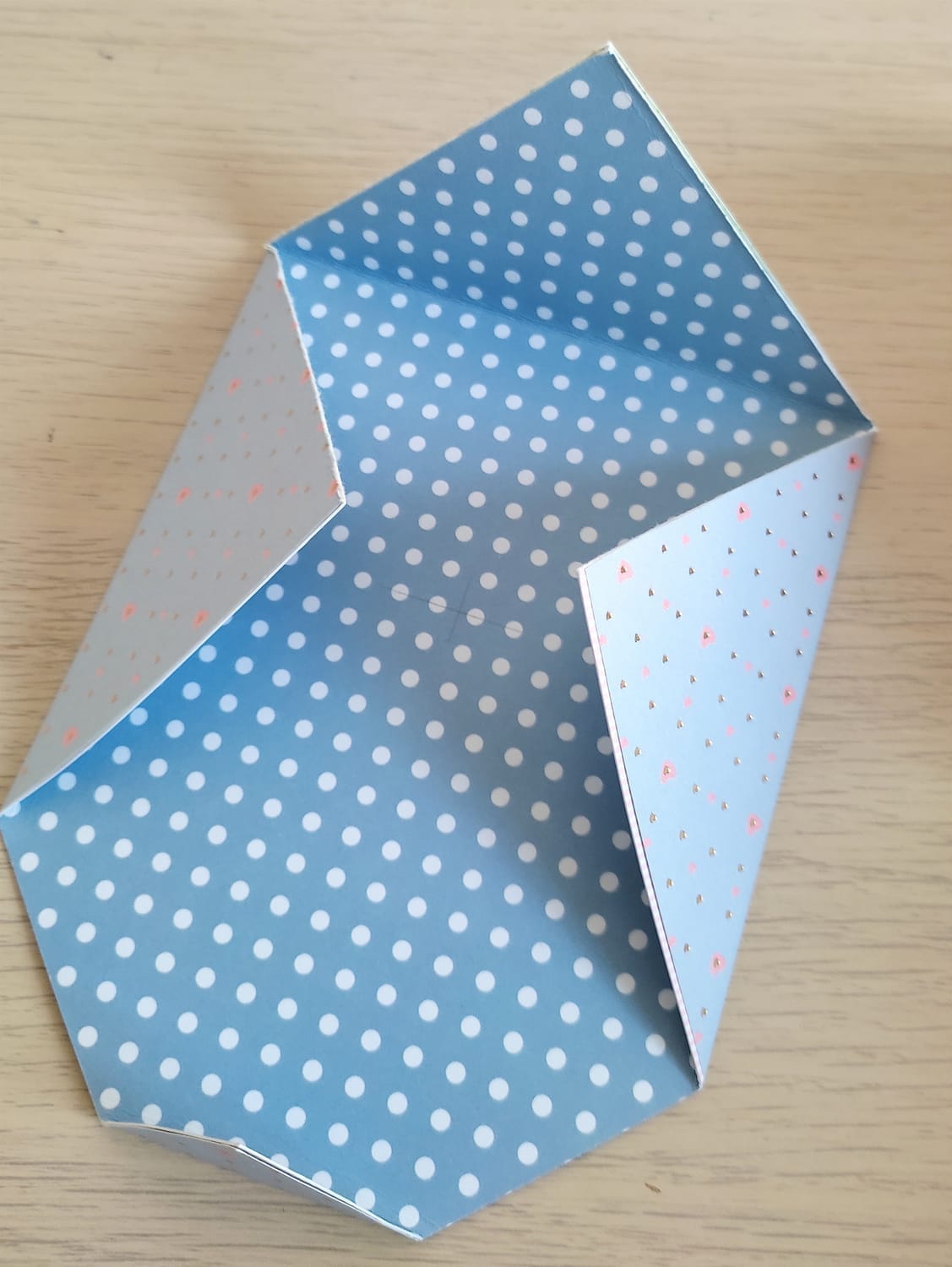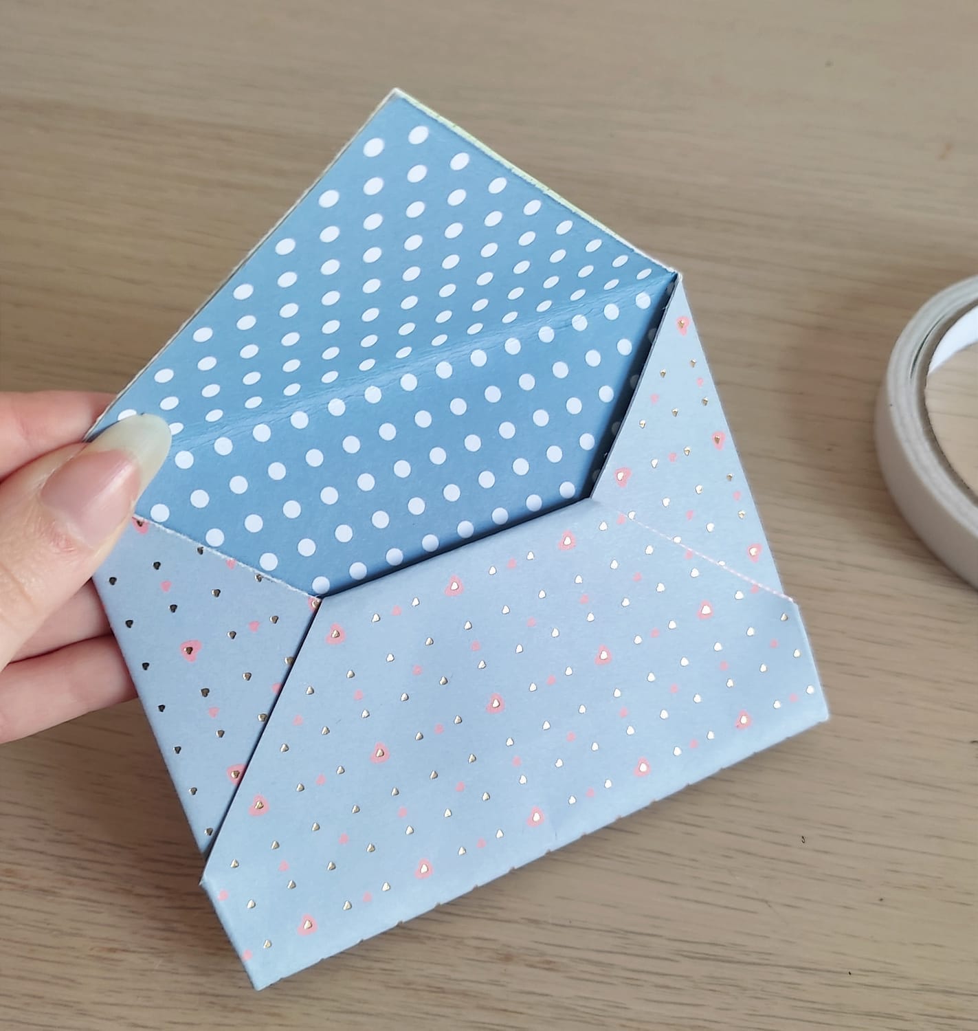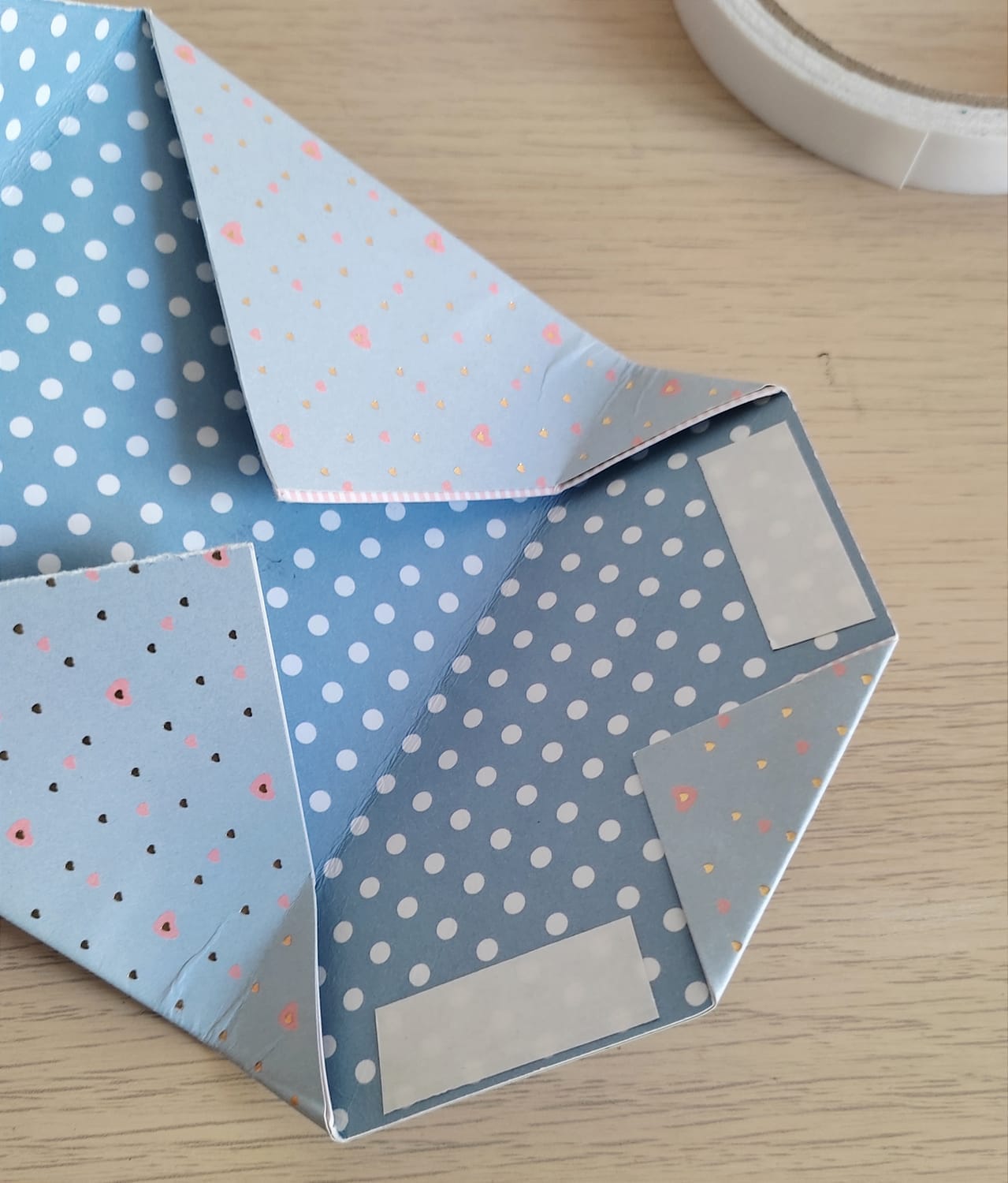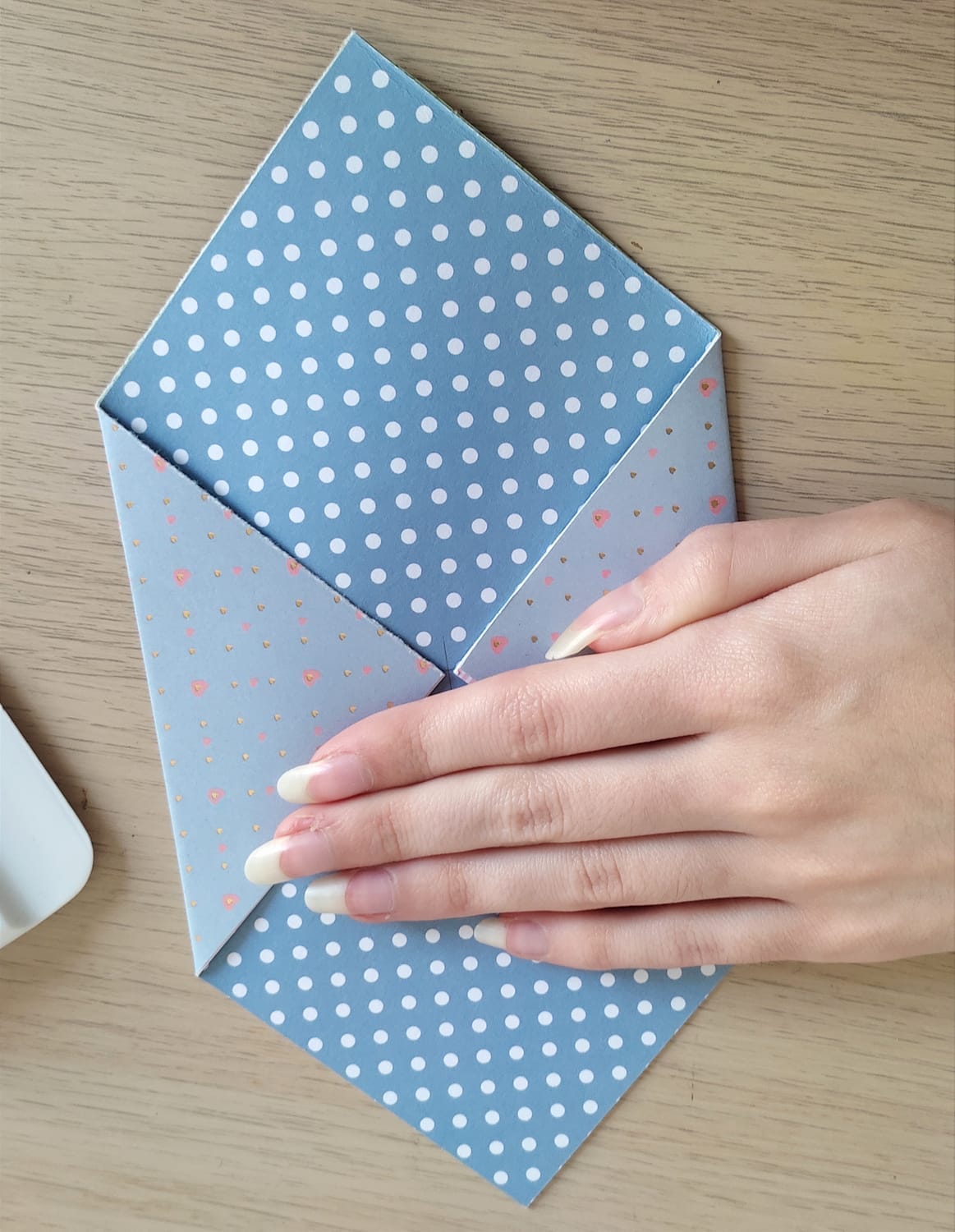 Sur un des côtés non pliés, rabattez la pointe et collez.